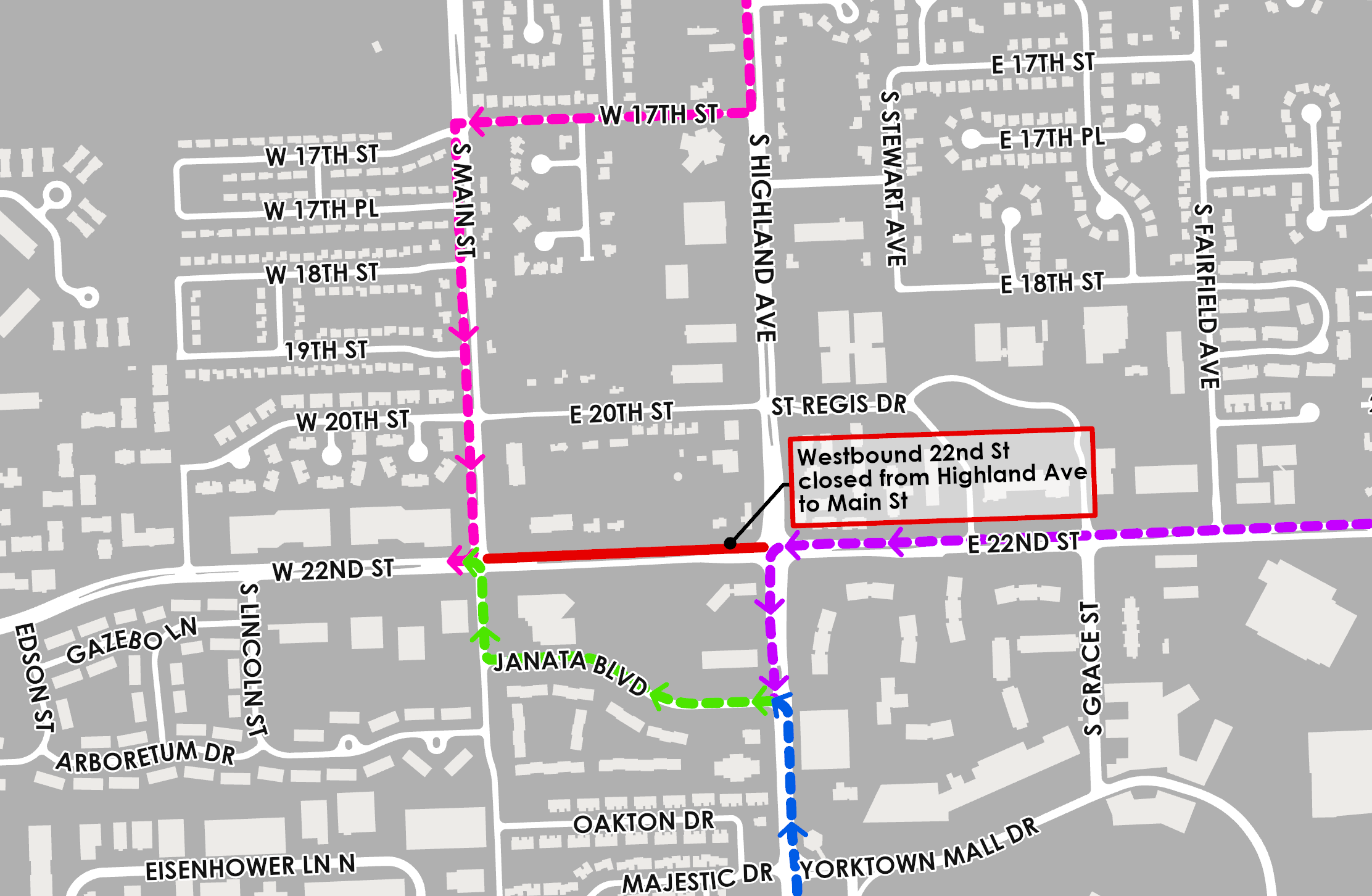 WB 22nd Street = SB Highland Avenue to Janata Boulevard to Main Street
